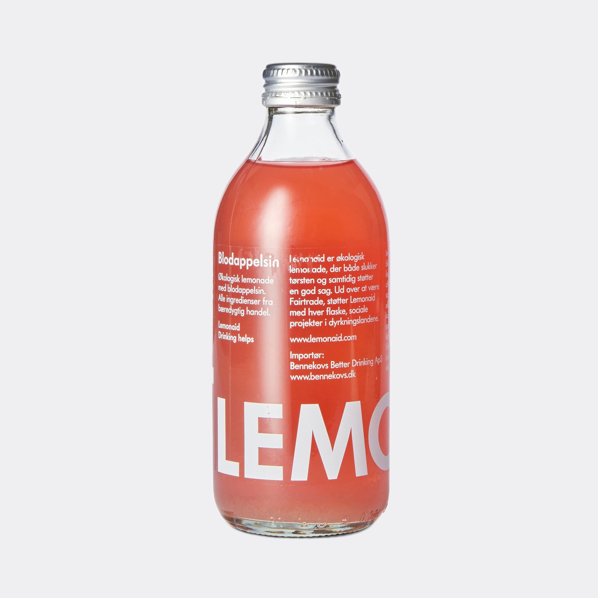 Lemonaid Blodappelsin Øko indeholder økologisk blodappelsinsaft, økologisk rørsukker, økologisk grapefrugt, økologisk citronsaft, økologisk appelsinsaft, økologisk kirsebærsaft & kulsyre intet andet. Appelsinsaft og rørsukker handlet i overensstemmelse med Fairtrade standarde.