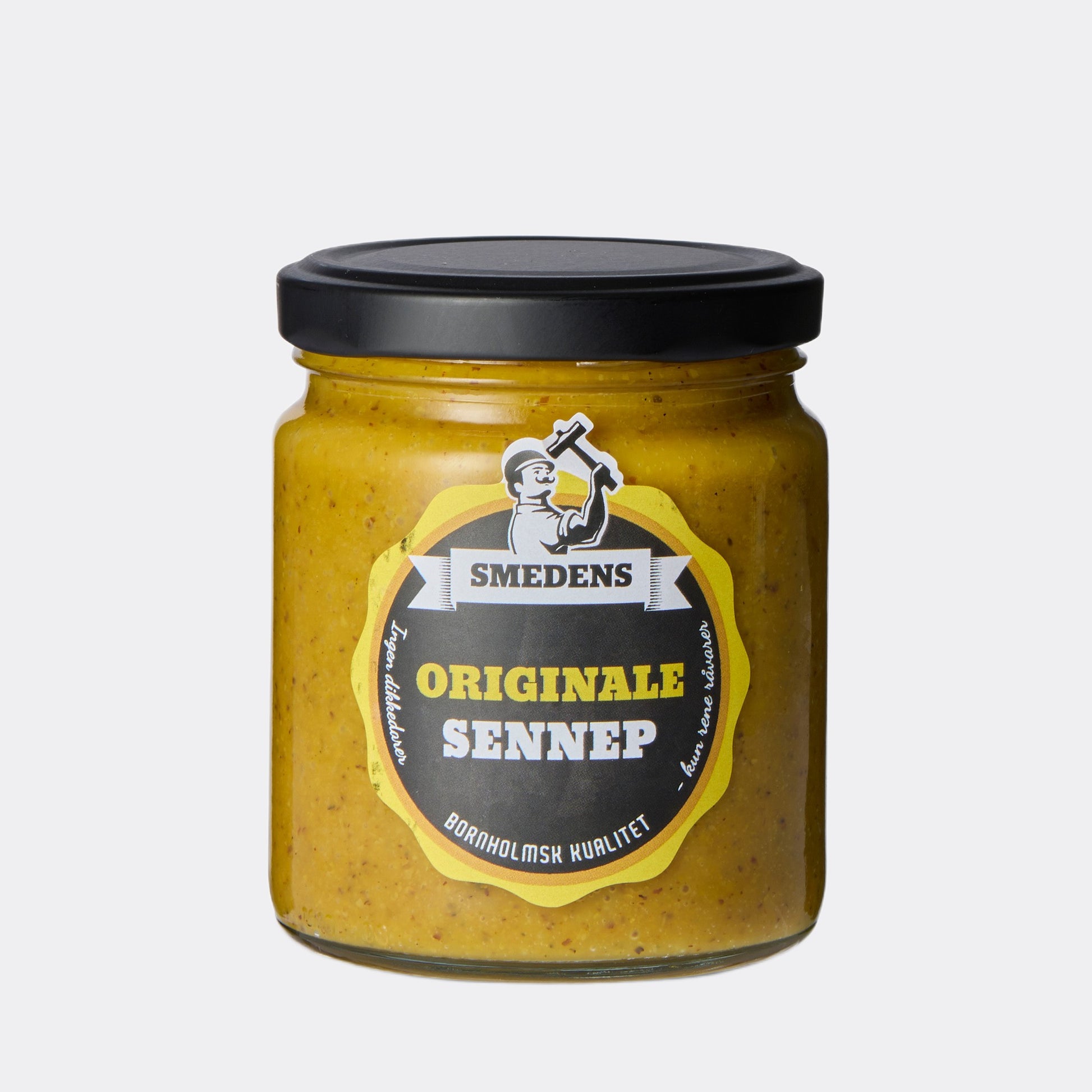 En Smedens klassiker, produceret efter gamle sennepstraditioner, bygget på lokalt dyrkede sennepsfrø fra Bornholm. Flot gul farve, rørt med lokalt produceret rapsolie. En sennep af høj kvalitet med en blød konsistens og naturlig sødme.