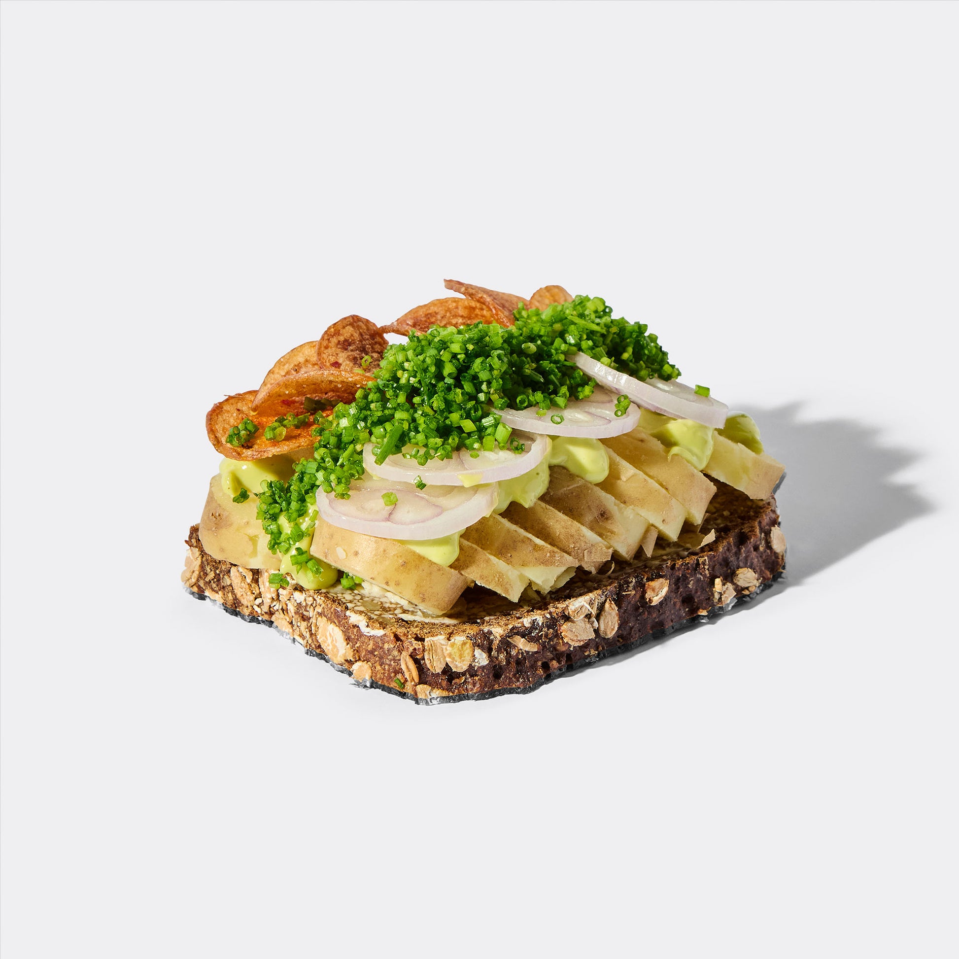 Kartoffelmad med danske kartofler, urtemayonnaise, urter, skalotteløg og kartoffelchips, på rugbrød.