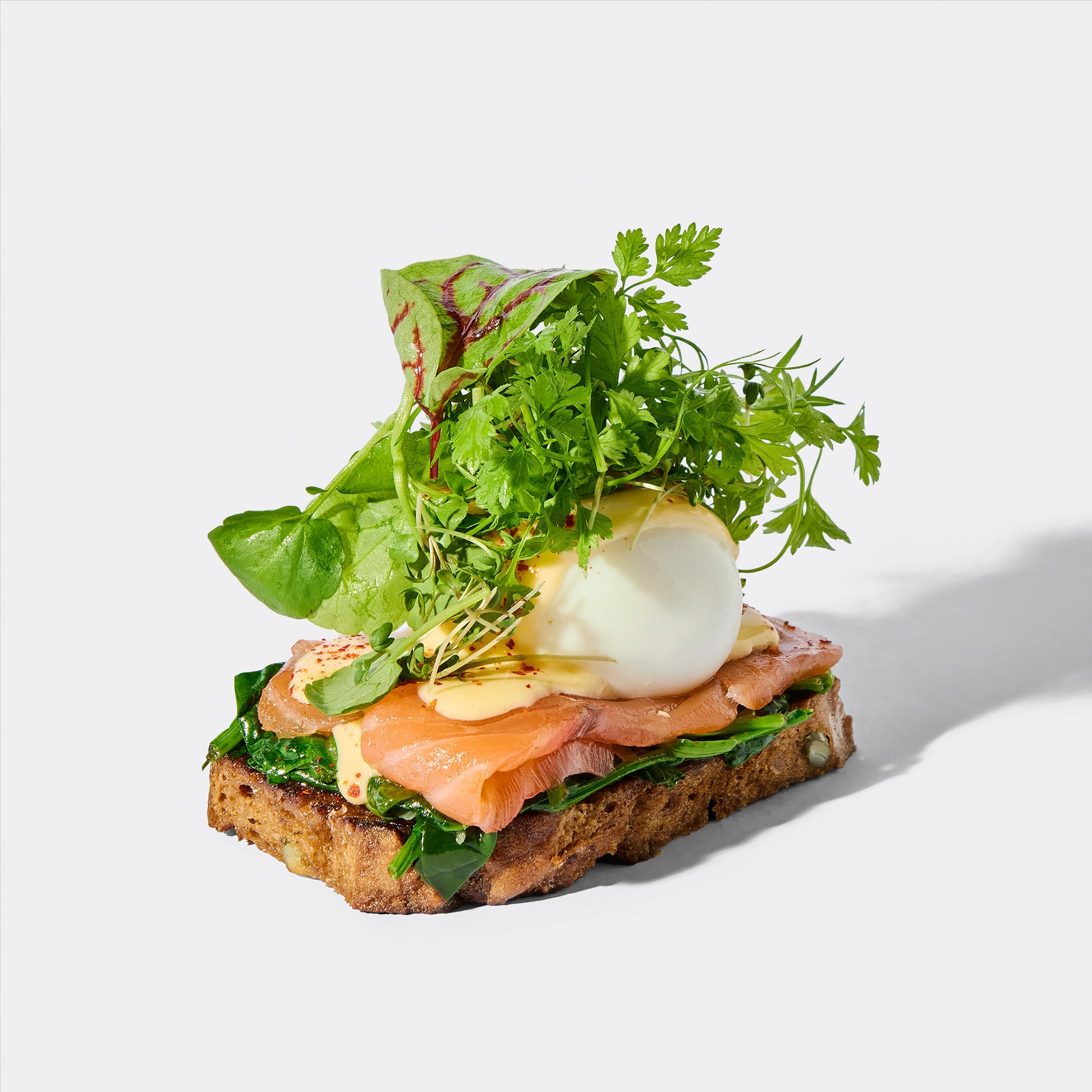 Røget laks med æg, spinat, urter, muskatnød & hollandaise creme, på ristet surdejsbrød.