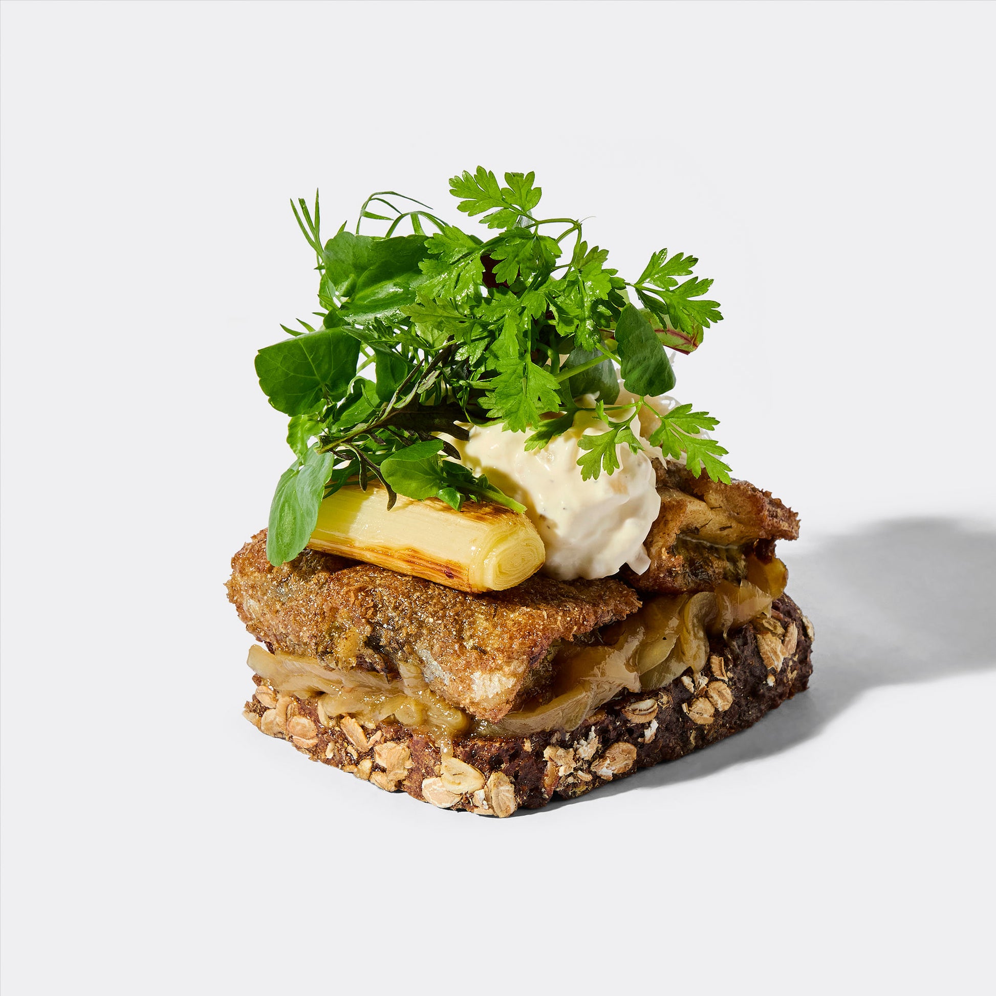 Stegt sild med bløde løg, porre, urter, cremefraiche & peberrod, på rugbrød.