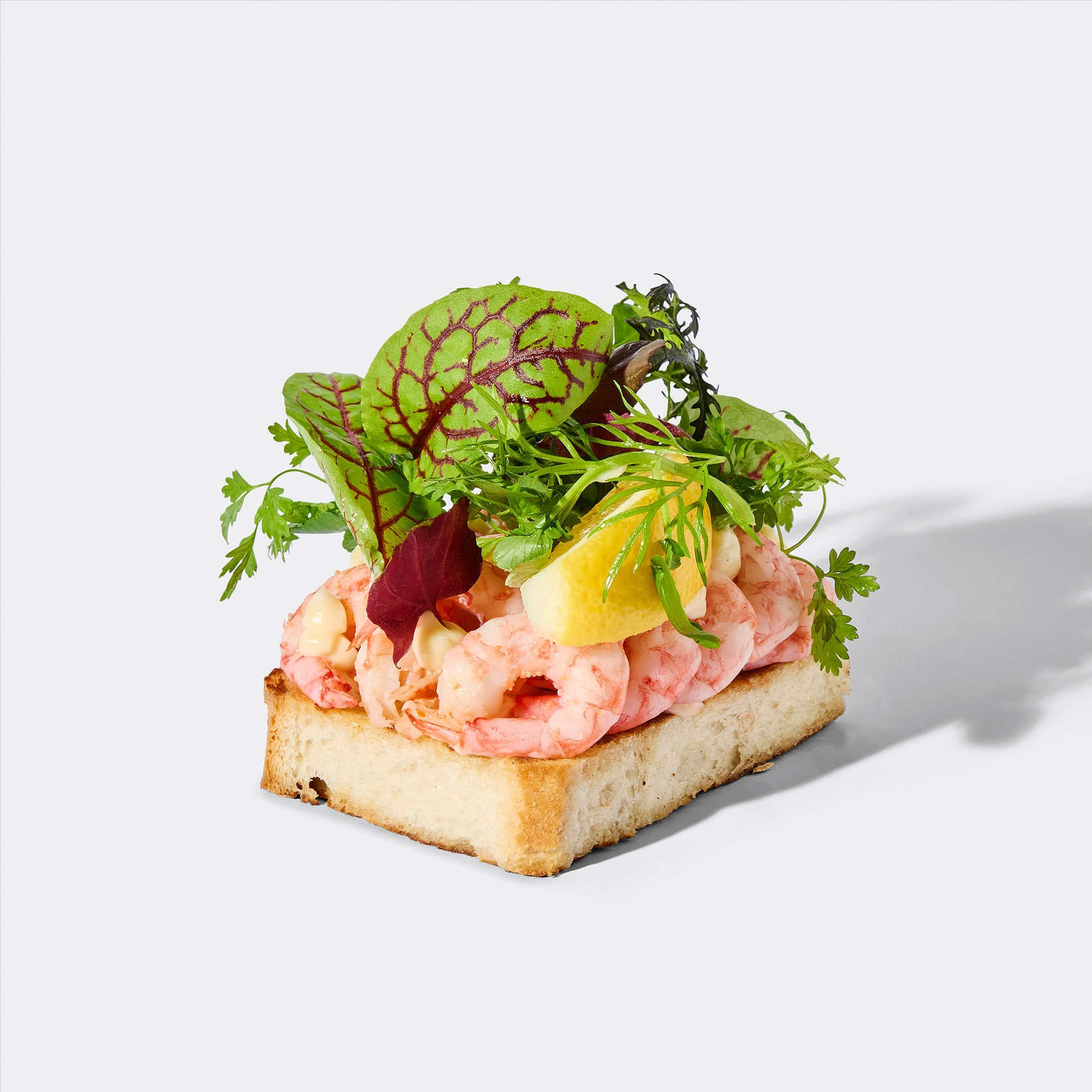 Håndpillede søkogte grønlandsrejer med mayonnaise, urter, dild & citron, på ristet formbrød.