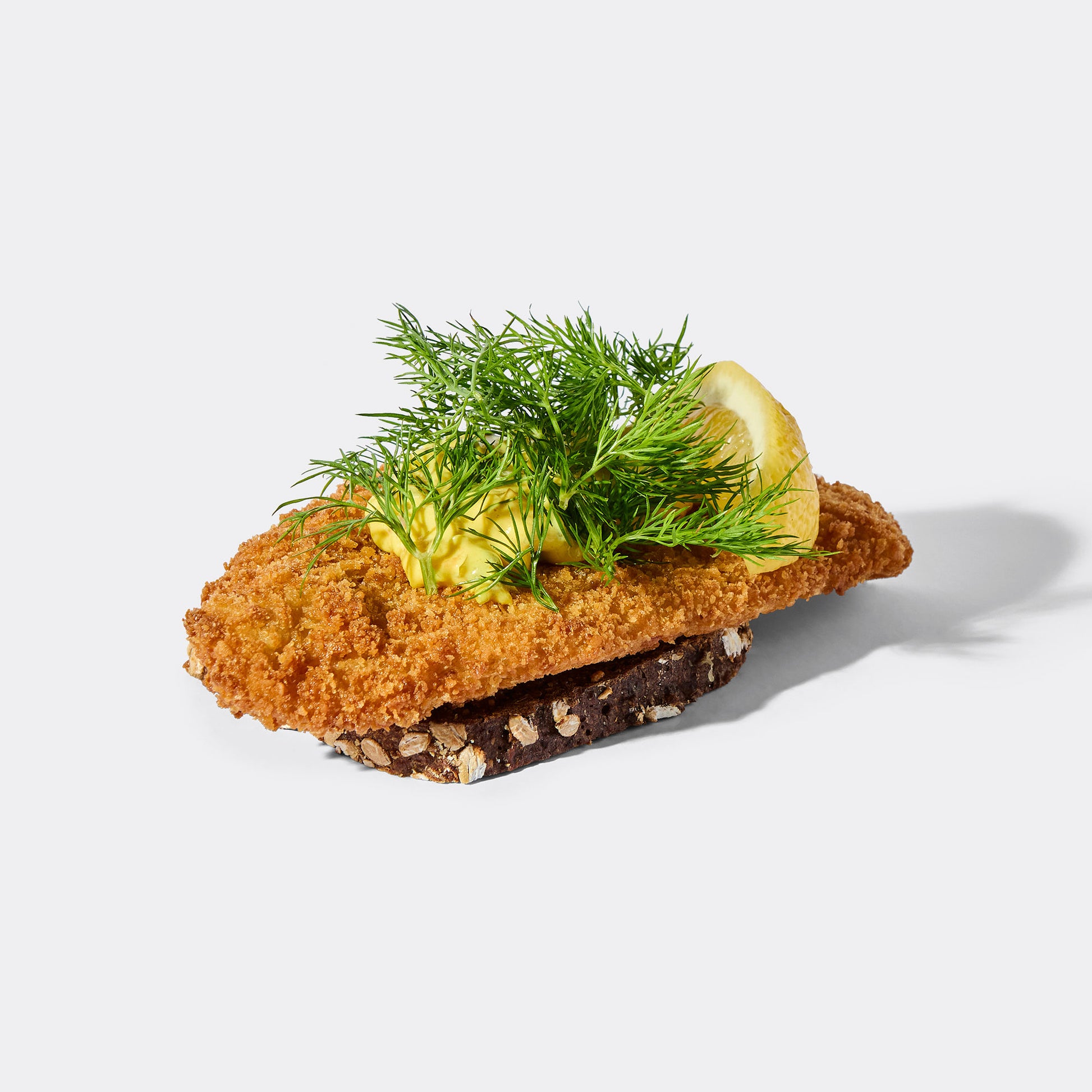 Friteret rødspættefilet med remoulade, citron & dild, på rugbrød.